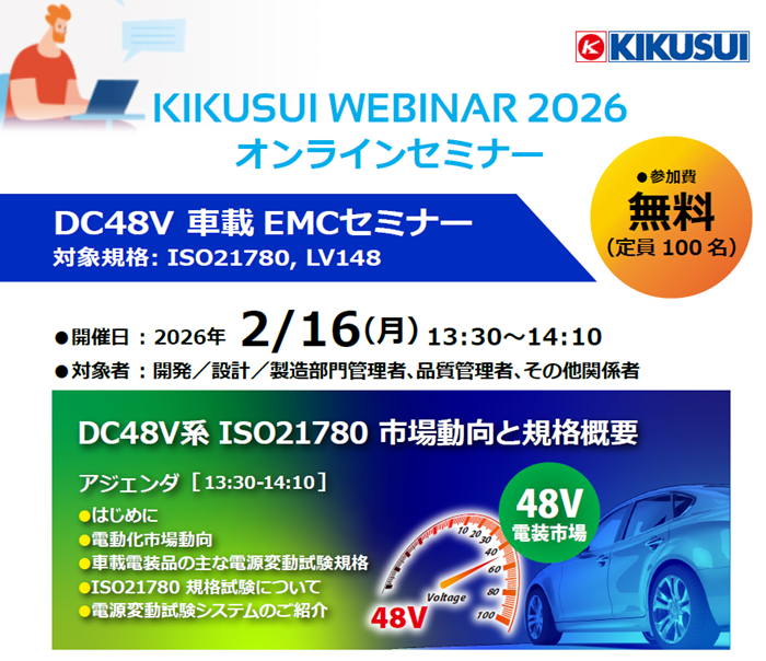 本セミナーでは48V ハイブリッド及び電動化において必要となる試験規格ISO21780 を中心に規格概要や試験方法などを解説します。